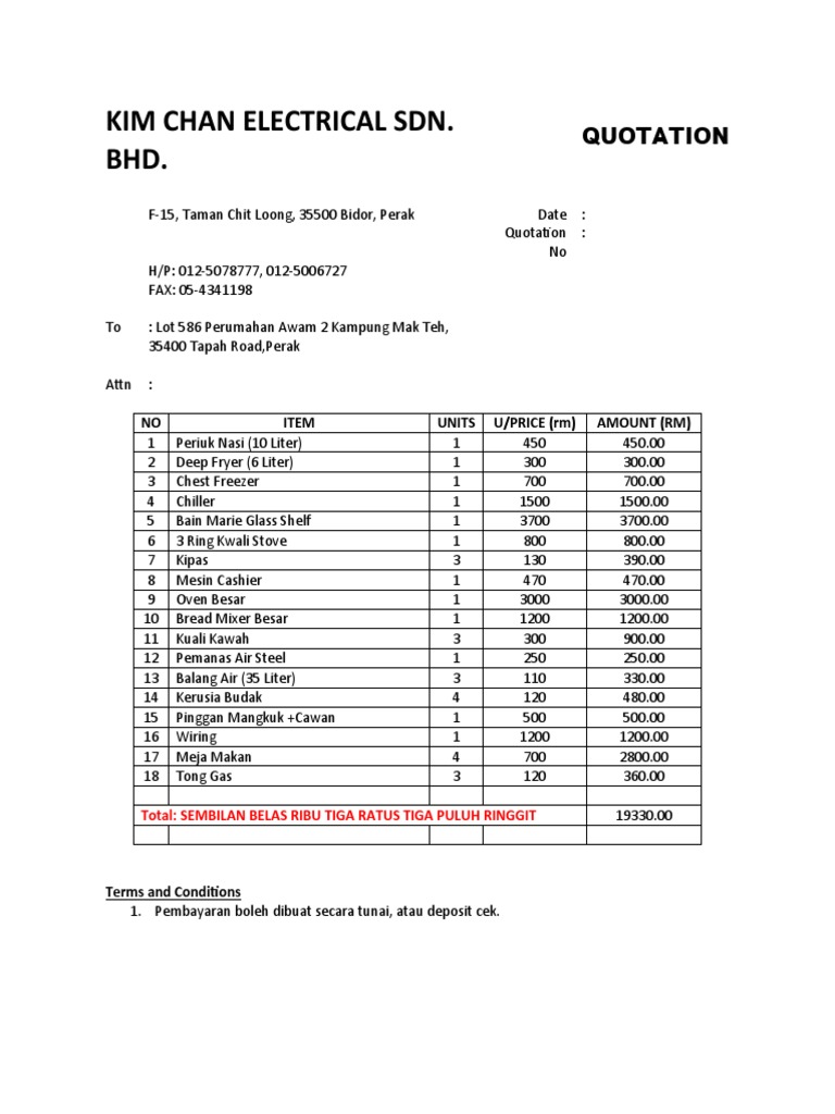 Quotation ialah dokumen atau surat penawaran yang mengandungi maklumat produk dan harga yang dijual setelah pelanggan melakukan permintaan surat penawaran. Pendawaian lampu cable size 15mm Dari RM 90. Contoh quotation ada dilampirkan dalam gambar di bawah.